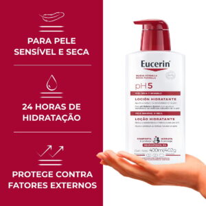 Eucerin pH5 Loção Hidratante Corporal é ideal para hidratação profunda e de longa duração. Desenvolvido com Dexpantanol, Glicerina e Vitamina E, restaura as defesas naturais da barreira da pele e protege contra fatores externos. Ajuda a manter o equilíbrio do pH da pele. Sua textura é leve e não deixa resíduos, ideal para peles sensíveis e secas.NART: 63003-03400-30